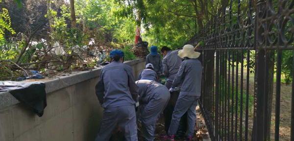 早上八時(shí)許,伴隨著夏日清晨溫暖的陽光,著裝整齊的十三名同志按照預(yù)定的方案開始清理工作,有序分工,團(tuán)結(jié)互助。他們有的用锨鏟,有的用手抓;有的用鋸割,有的做清掃。隨著氣溫的上升,汗水浸濕了衣裳,塵土掛落在臉龐,大家激情不減,干的熱火朝天。隨著一袋袋的枯葉、一車車的垃圾、一捆捆的殘枝被清運(yùn)出去,整潔干凈的隔離帶逐漸顯露出來。